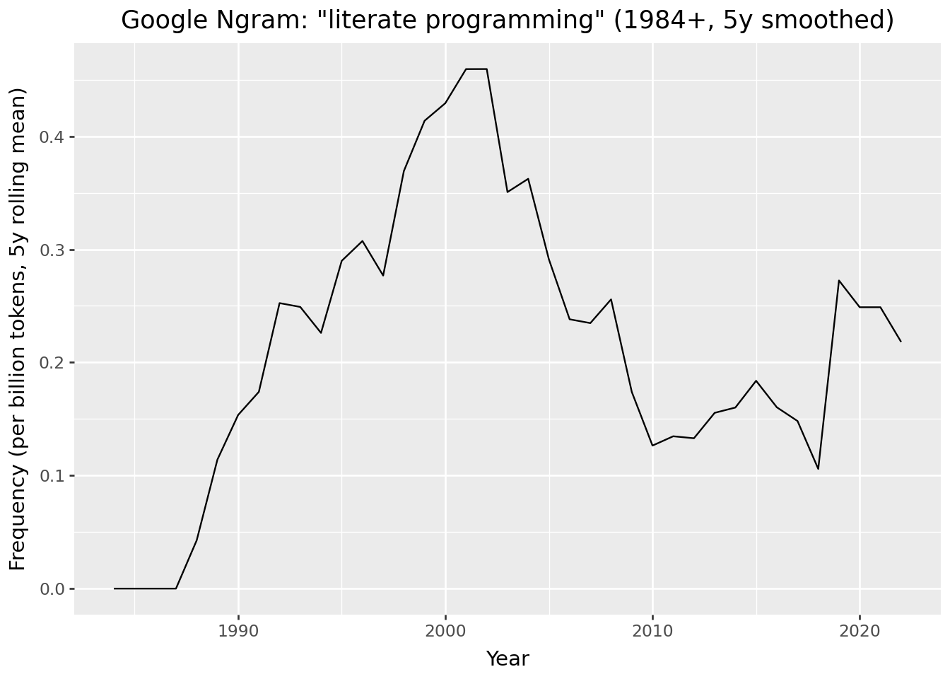 I was interested to find out when “literate programming” became popuar, so I used Google Books Ngram Viewer search for this term from 1800 to 2026. This shows the frequency of use of this term in published books.