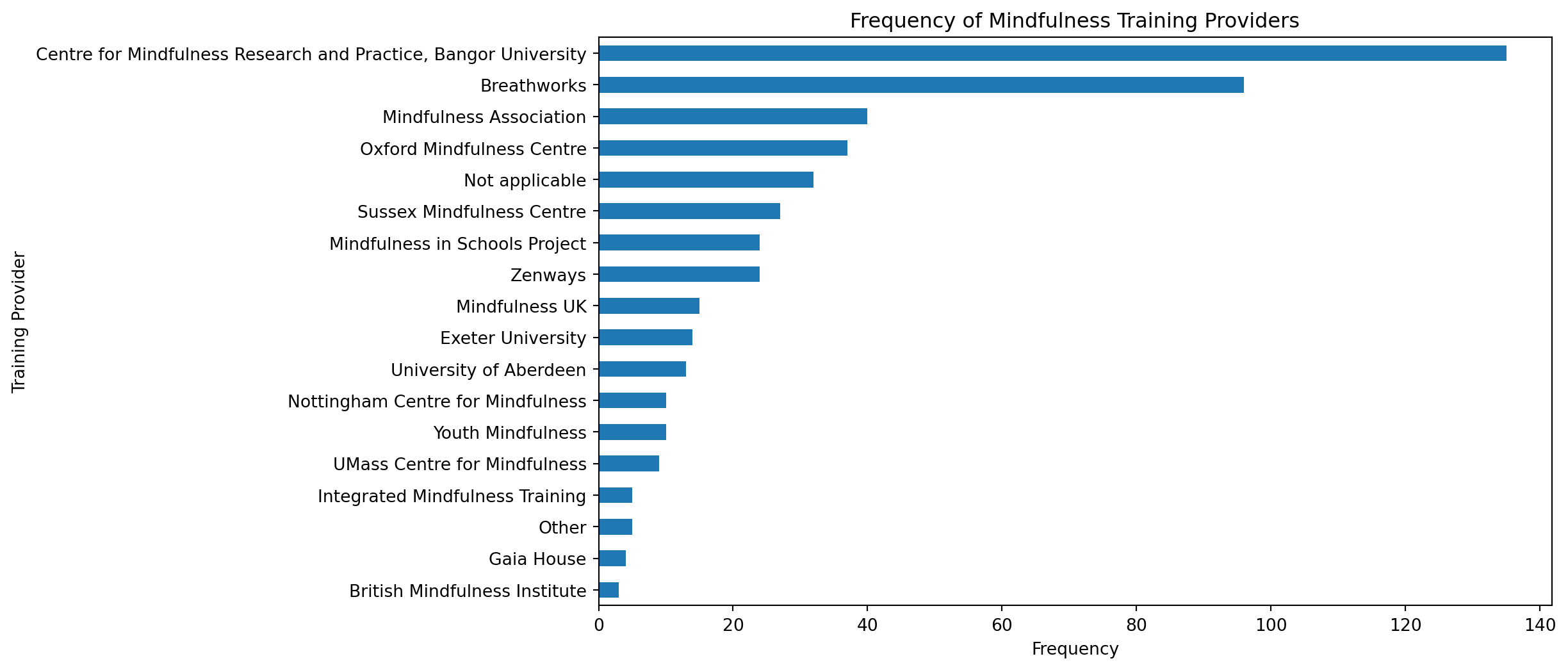 This code performs data manipulation and visualization to analyze mindfulness training providers. Using Pandas for data handling, it loads, renames, and filters a dataset, focusing on the training_providers column. Key data manipulations include replacing specific entries and filtering out irrelevant data. Matplotlib is then used to plot the frequency of each provider in a horizontal bar chart. The results indicate that the top three mindfulness training providers are ‘Centre for Mindfulness Research and Practice, Bangor University’ (135 instances), ‘Breathworks’ (96 instances), and ‘Mindfulness Association’ (40 instances), showcasing their prevalence in the dataset.